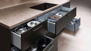 - Cajones con separadores y compartimentos internos: ayudan a organizar cubiertos, utensilios de cocina y pequeños electrodomésticos evitando que todo se mezcle.